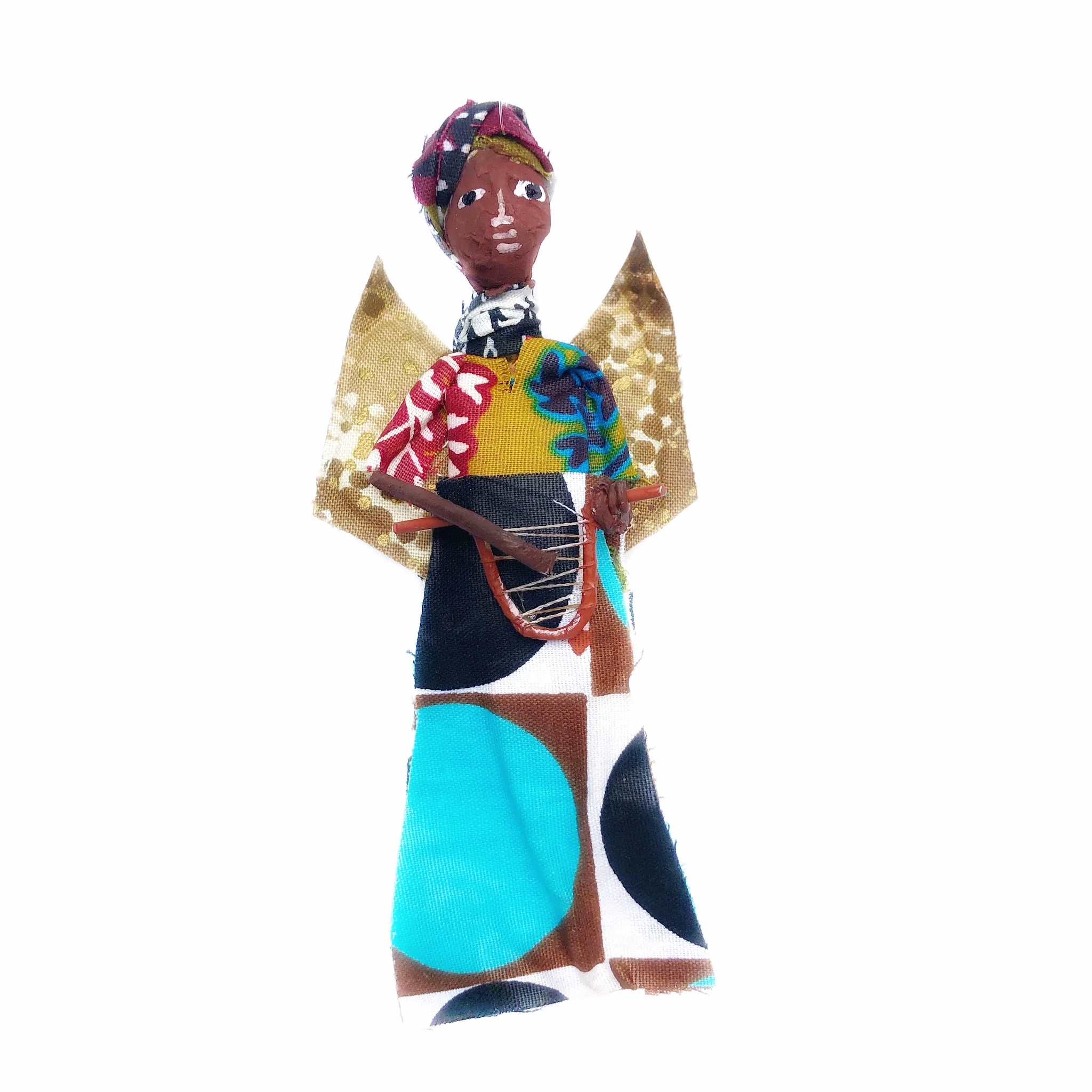 Our African Figurine Angel Ornaments are handmade by artisans in Uganda, East Africa. These truly unique Christmas ornaments are popular for their detail and whimsy. The paper mache angel face is painted by hand while dresses and wings are crafted from recycled kitenge fabric scraps. No two patterns are exactly alike! Choose from four styles: Harp, Star, Flute or Praying. Or purchase a special full set of four HERE.